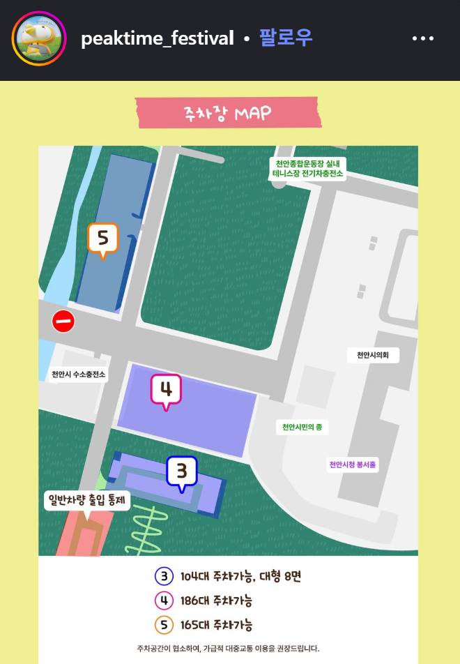 차량 운전자들은 아무래도 어딜 가던 주차장 정보를 찾게되길 마련입니다. 주차장 정보를 찾아보니 천안 시민체육공원 잔디광장에 주차장이 있는 것이 아니라 그 옆에 천안 시청 앞에 있는 주차장에 주차를 할 수 있습니다. 주차 가능한 장소가 도합해서 355대 정도 밖에 안됩니다. 사전예매로 풀린 티켓만 2,000장이 넘는데 주차장은 355대 밖에 되지 않는다니 조금 놀랍습니다. 신불당이 아무래도 핫플레이스라 그 건너편 주차장은 안그래도 자리가 없는 편인데, 뮤직 페스티벌이 열리면 여긴 아예 포화상태라고 봐야할 것 같네요. 주차장이 협소하니 만큼 대중교통을 이용하는 것이 가장 좋겠습니다.