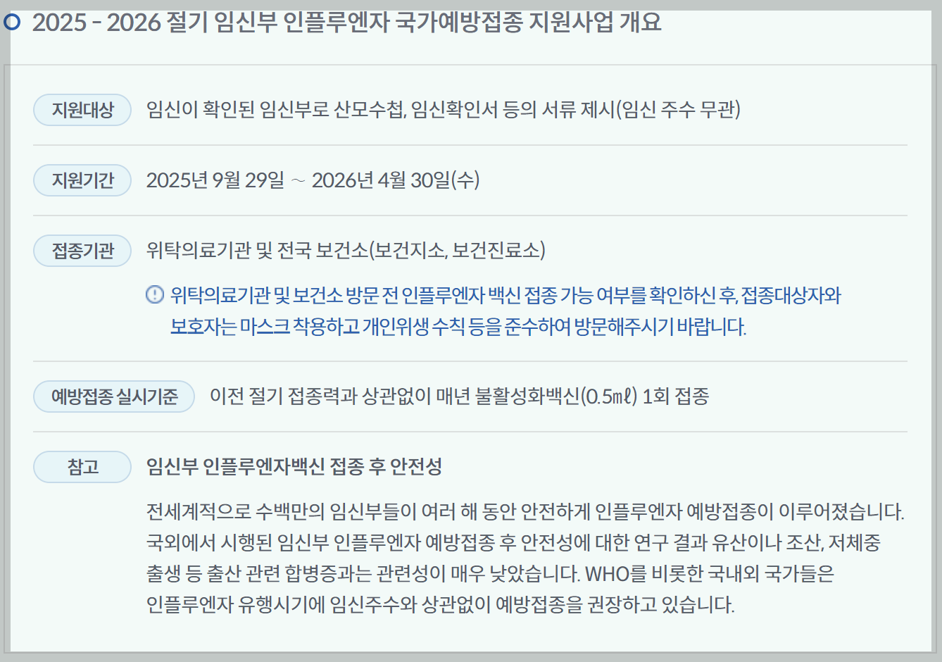 2025 ~ 2026년 절기 임신부 인플루엔자 국가예방접종 지원사업 개요 (출처: 질병관리청)